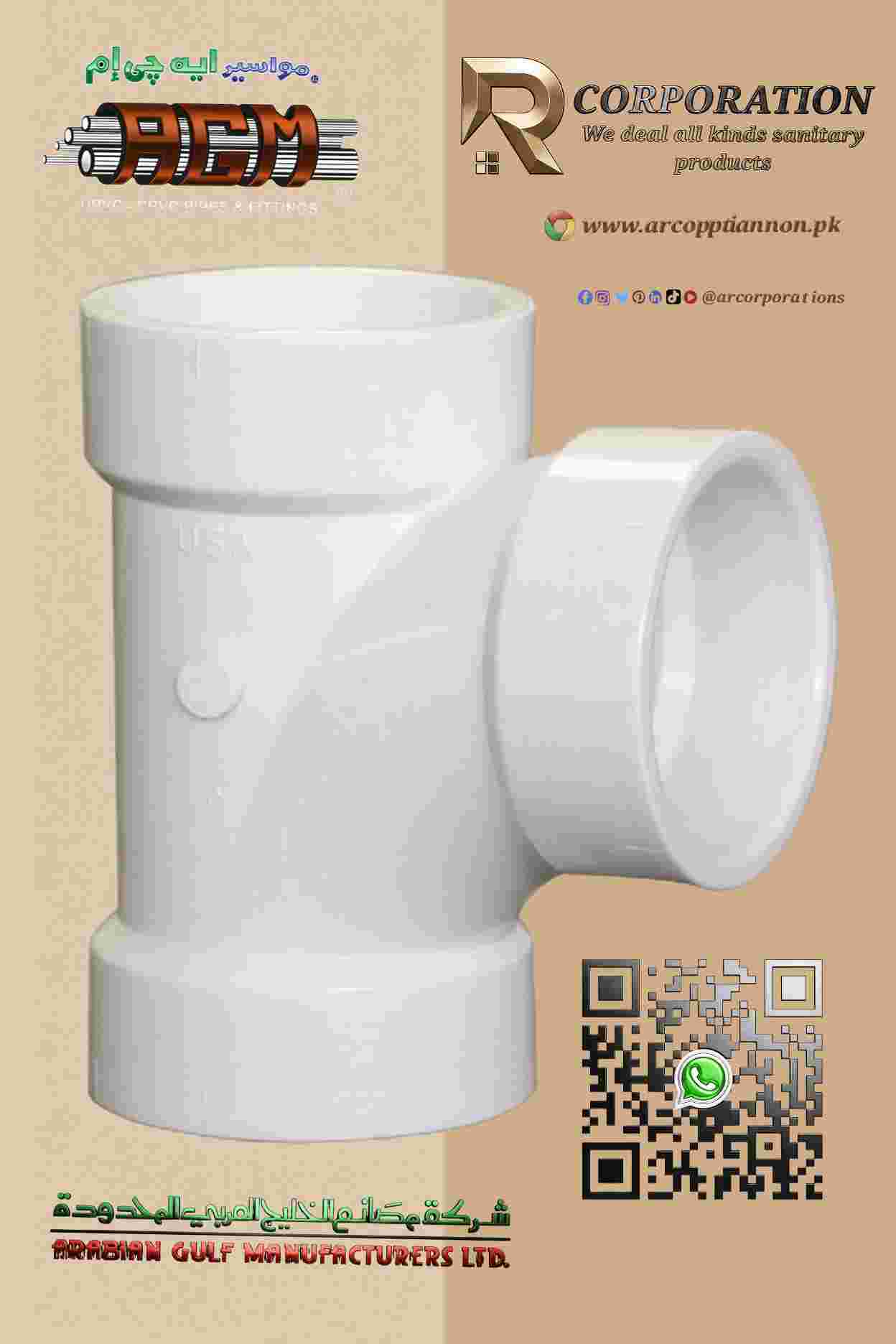 The AGM UPVC Sanitary Tee 4″ Schedule 40 is a high-quality plumbing fitting manufactured by Arabian Gulf Manufacturers Ltd (AGM Pipes), based in Jeddah, Saudi Arabia. It is part of AGM’s comprehensive range of un plasticized polyvinyl chloride (UPVC) pipes and fittings, designed for reliable performance in demanding applications. This sanitary tee is specifically engineered as a molded, solvent-weld fitting that allows for the connection of a branch line (typically horizontal) into a main vertical drain or sewer pipe at a 90-degree angle. It features a smooth interior for optimal flow, corrosion resistance, and lightweight construction, making it ideal for modern building projects. The product is produced using advanced manufacturing technologies and world-class materials, ensuring durability and compliance with international standards. As an imported item from Saudi Arabia, it is widely distributed to markets like Pakistan and other regions for construction and infrastructure needs.