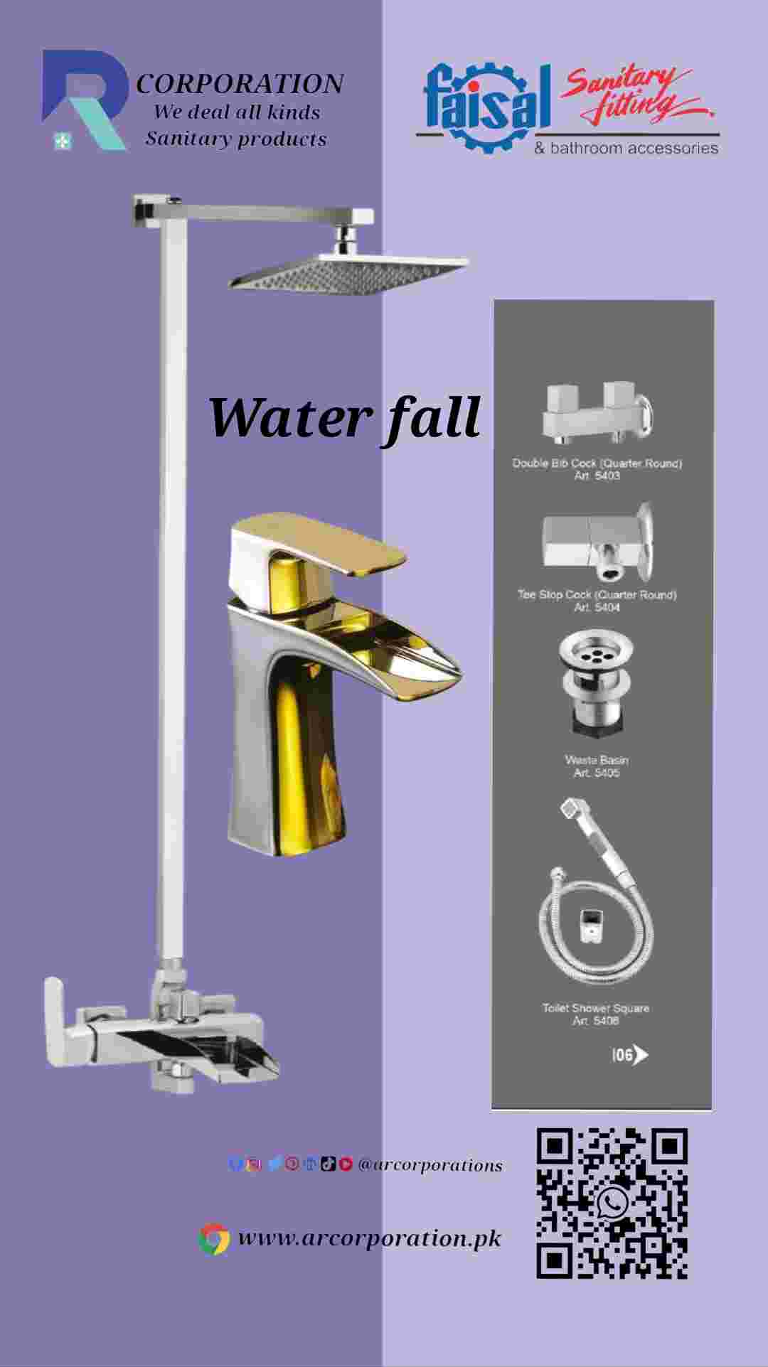 The Faisal Sanitary Waterfall Series Model 5407 is a premium bathroom fitting set designed for modern bathrooms. It includes a range of essential fixtures with a contemporary waterfall design and chrome finish, offering both style and durability.